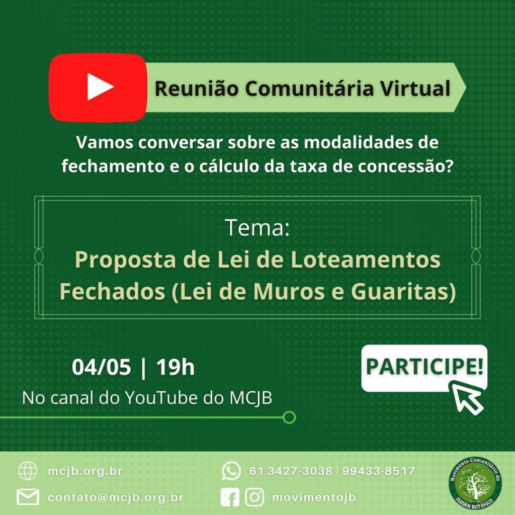 Se aproxima a audiência pública (11/05) sobre o Projeto de Lei Complementar (PLC) dos Muros e Portarias. Com isso, preparamos uma reunião comunitária virtual que será realizada na terça (04/05), às 19h, para debatermos com a comunidade sobre! ![]()